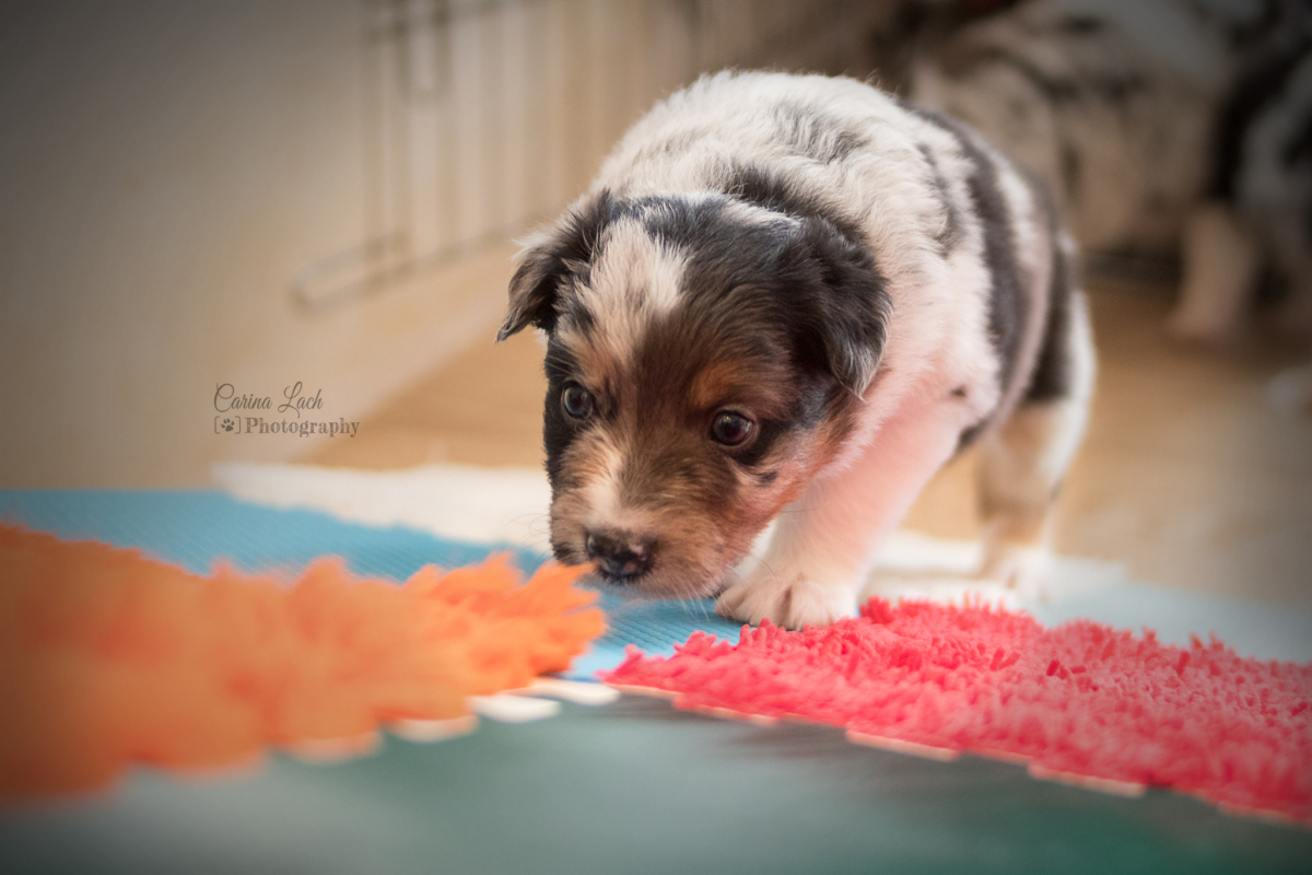 Die Welpen werden in den ersten paar Wochen täglich gewogen und ihre Entwicklung dokumentiert, wozu auch wöchentliche Foto-Shootings in vertrauter Umgebung gehören. (Die Bilder bekommen die Wepenkäufer später alle in guter Auflösung auf einem Foto-Stick mit.) Seit unserem D-Wurf führen wir vom 3. bis zum 16. Lebenstag - in der vegetativen Phase, in der Augen und Ohren noch geschlossen sind - Early Neurological Stimulation (ENS) durch. Dabei handelt es sich um ein gezieltes Bio-Sensor-Programm mit kurzen Übungen von jeweils 3-5 Sekunden. Diese frühzeitige neurologische Förderung setzt Reize, die in diesem Entwicklungsabschnitt normalerweise nicht vorkommen. Ziel ist es, das Nervensystem optimal zu unterstützen und die körperliche und mentale Entwicklung positiv zu beeinflussen. Studien zeigen Vorteile wie eine verbesserte Herzleistung, ein stärkeres Immunsystem, höhere Stresstoleranz sowie besonders aktive, soziale und erkundungsfreudige Hunde. Später stehen dann kleine Akzeptanzübungen an der Tagesordnung. So werden die Welpen bereits daran gewöhnt, ein Halsband zu tragen und sich überall anfassen zu lassen, sowie an das Bürsten und Krallenschneiden herangeführt.